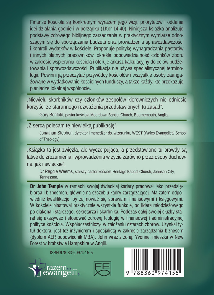 John Temple jest nie tylko biznesmenem z wieloletnim doświadczeniem na czele różnych firm, które samo w sobie nie upoważnia jeszcze przecież do pisania na temat finansów kościoła – autor jest również chrześcijaninem pragnącym, żeby nakazy, zasady i przykłady Biblii miały wpływ na każdą dziedzinę życia. Temple twierdzi, że funkcjonowanie kościołów nie jest tu wyjątkiem. Po dokładnym stosowaniu Słowa Bożego w swoich praktykach biznesowych (zob. jego książkę Be Successful, Be Spiritual wydaną przez Day One Publications).Polski tytuł „Duchowe podstawy prawdziwego sukcesu – Jak służyć Bogu w swoim miejscu pracy” jest do nabycia też w Fundacji Ewangelicznej. John skierował uwagę na kwestie finansowe lokalnej wspólnoty chrześcijańskiej, do których stosuje te same kryteria biblijne. Jego długotrwałe zaangażowanie w zakładanie kościołów i przywództwo także upoważniają go do zajmowania się tym tematem. Dzieląc się przenikliwymi spostrzeżeniami i praktycznym zastosowaniem, autor porusza cały zakres tematów, takich jak szafarstwo, budżetowanie, zarobki i wiele mniej znaczących kwestii.
